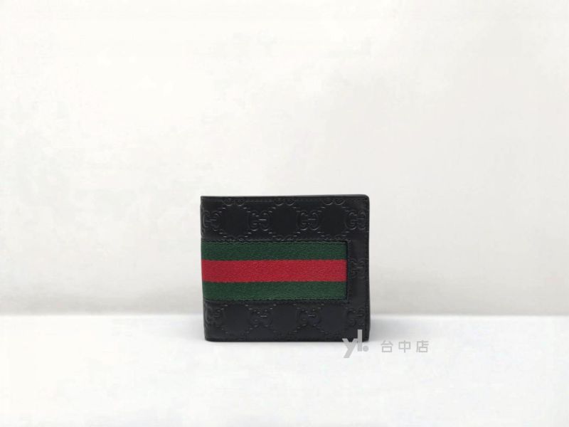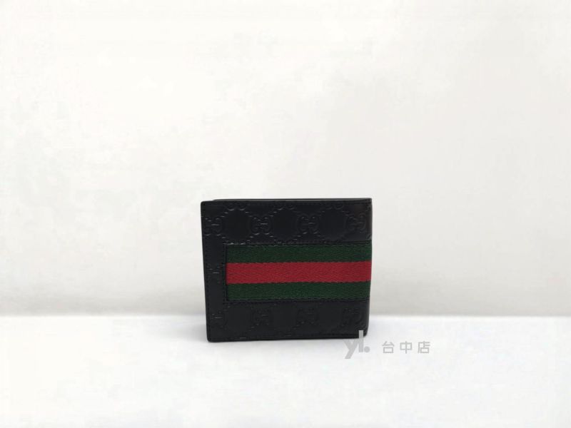 I1807 Gucci皮夾 黑牛皮壓紋綠紅綠織帶對開3卡短夾408826 (台中店)