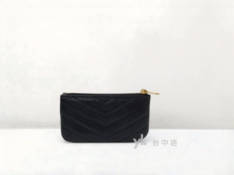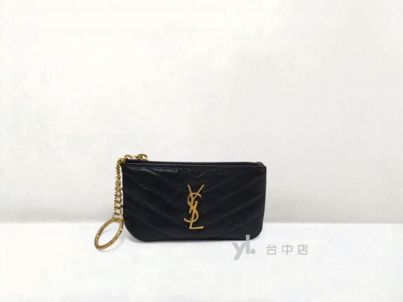 I1852 YSL零錢包 黑牛皮V型紋金釦一字拉鑰匙圈零錢包 (台中店)