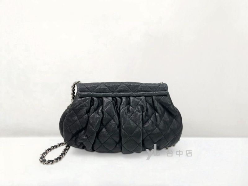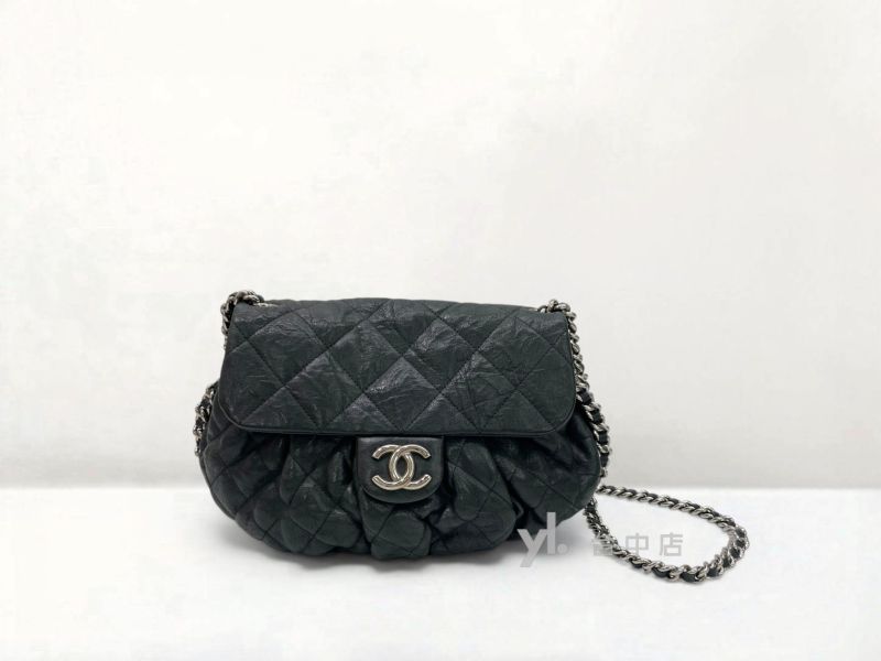 T0055 Chanel包包 黑色牛皮抓皺銀皮穿鍊滾邊下蓋斜背包 (台中店)