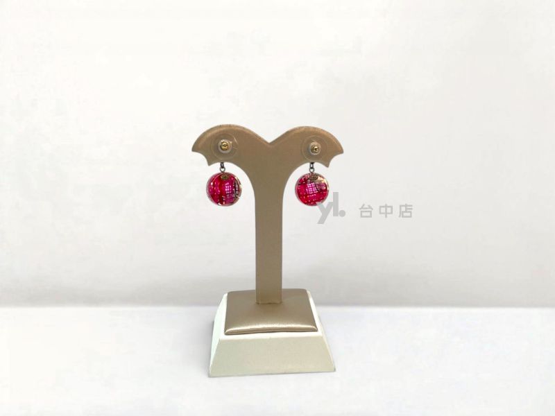 I1314 Chanel耳環 金色雙C垂吊圓形粉紅呢料金鍊壓克力針式耳環 (台中店)