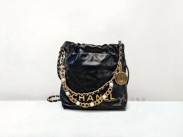 V4240 Chanel包包 黑牛皮菱格紋Mini22珍珠鏈金釦手提肩斜背包AS3980 (台南店)