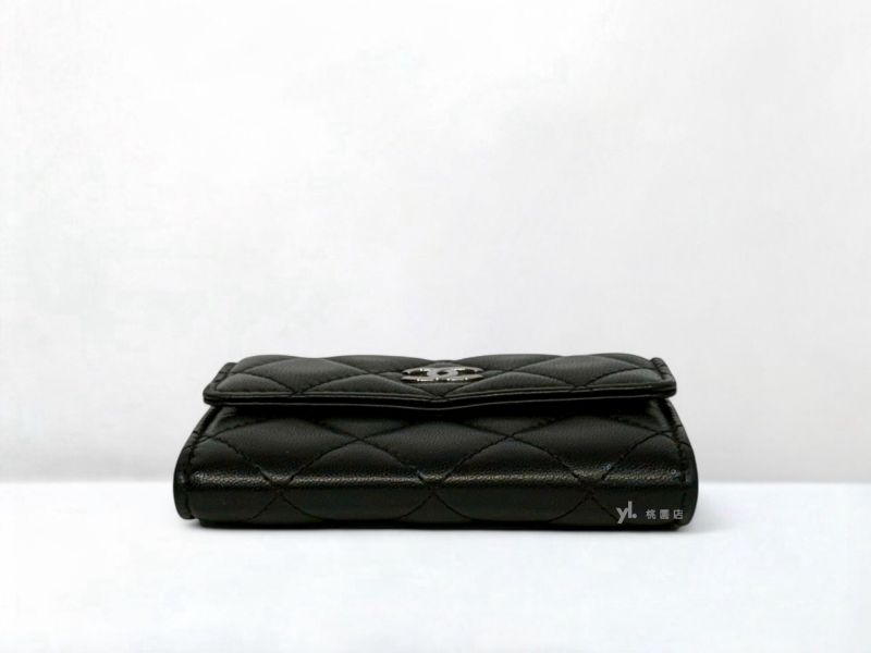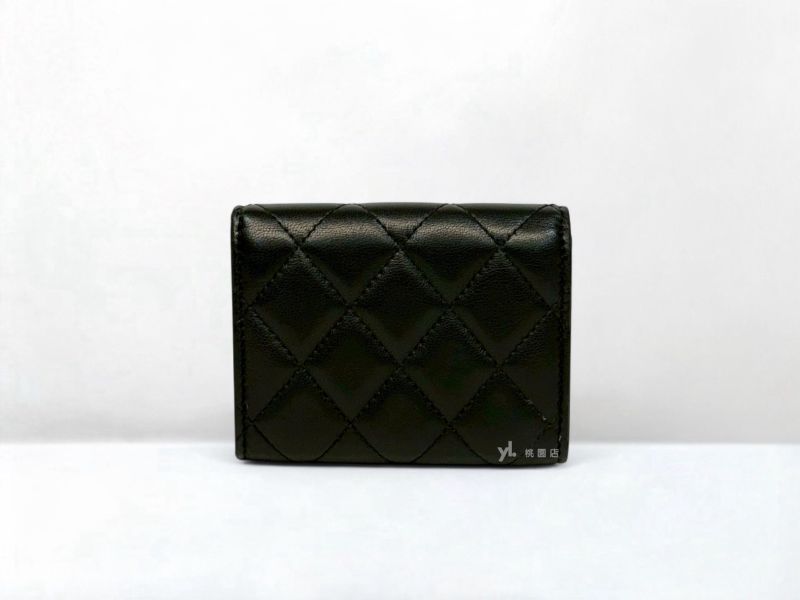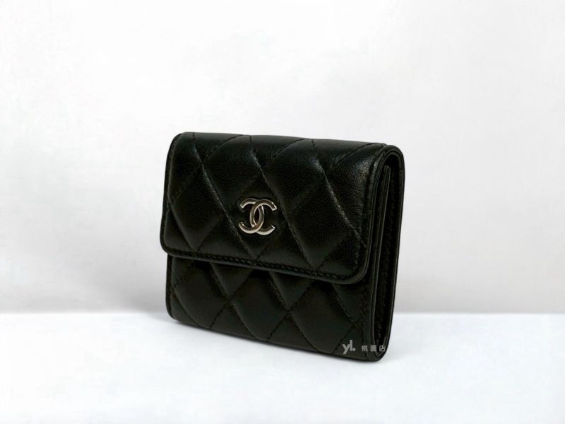 C3448 CHANEL卡包 黑色羊皮銀釦大雙C logo雙層下蓋卡包 (桃園店)