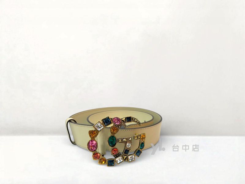I0643 Gucci皮帶 米色牛皮霧金彩色寶石GG釦頭皮帶 (台中店)