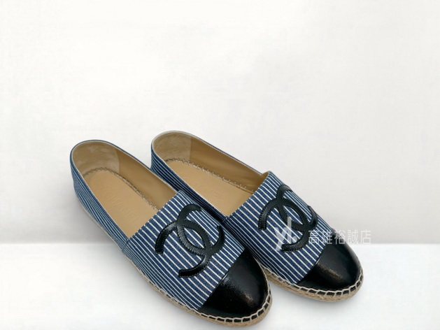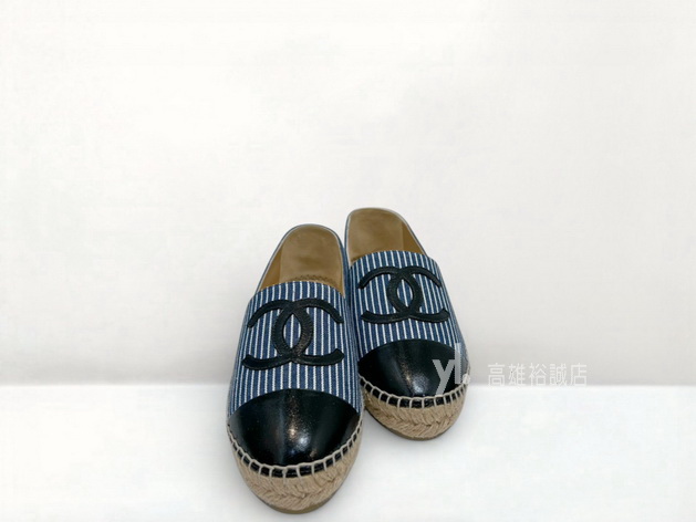 路徑: 首頁 / 商品 / BRAND / Chanel / P5018 Chanel鉛筆鞋 藍白條紋帆布拚黑牛皮草編鉛筆鞋G29762 (高雄裕誠店)...