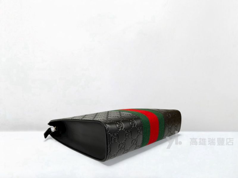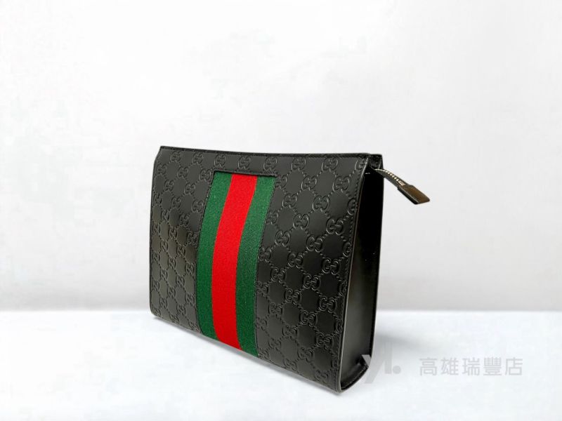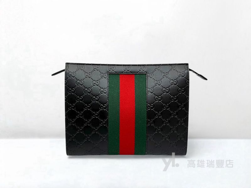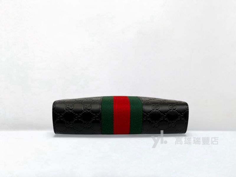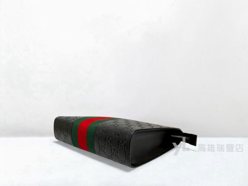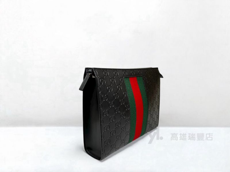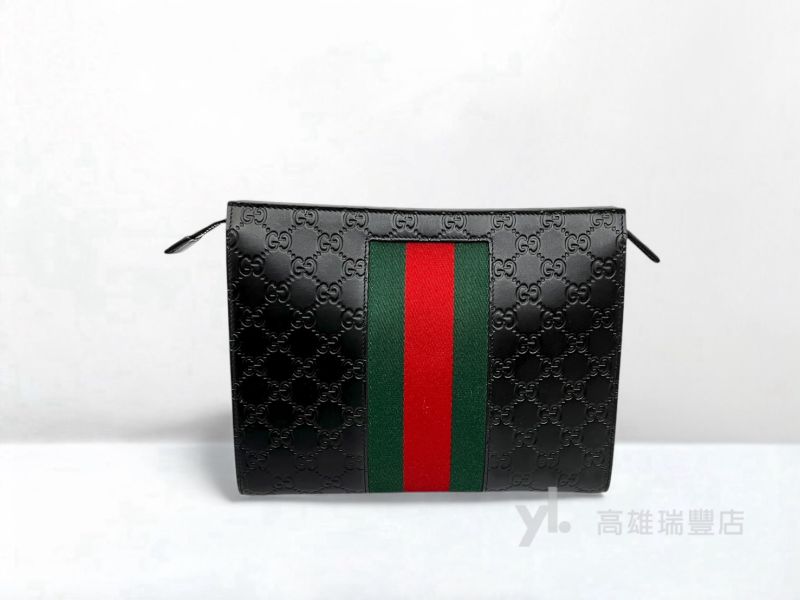 Q0298 Gucci包包 黑牛皮GG壓紋綠紅綠織帶一字拉手拿包(瑞豐店)