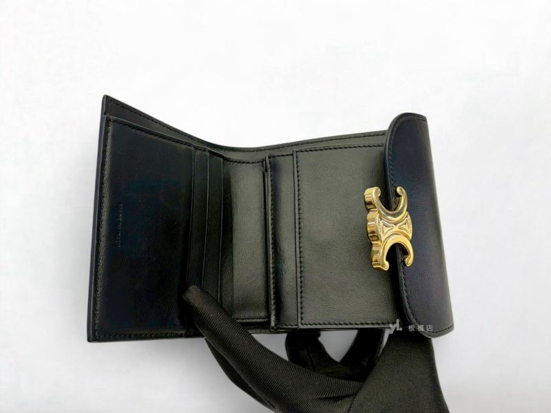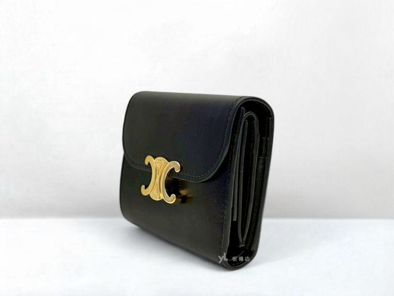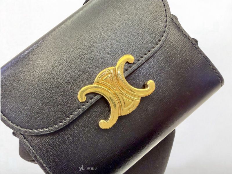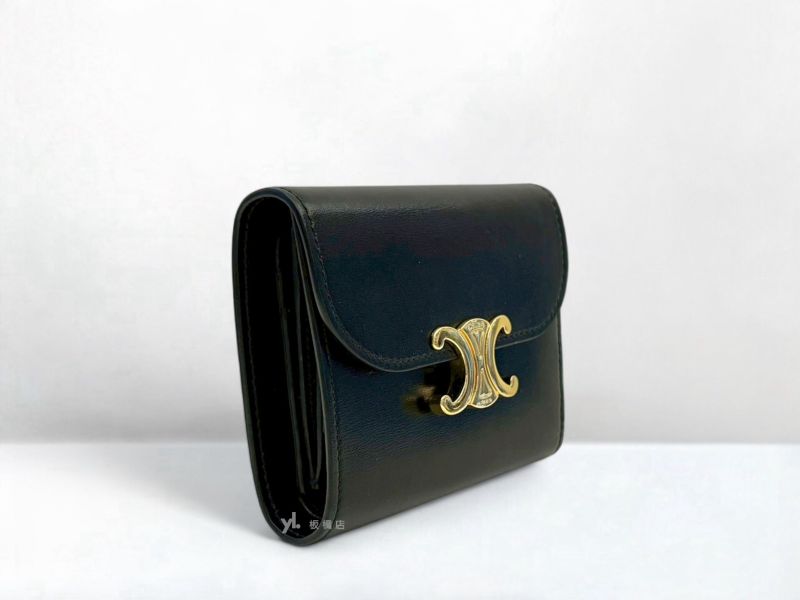 S5082 Celine皮夾 TRIOMPHE黑牛皮翻蓋三折短夾 (板橋府中店)