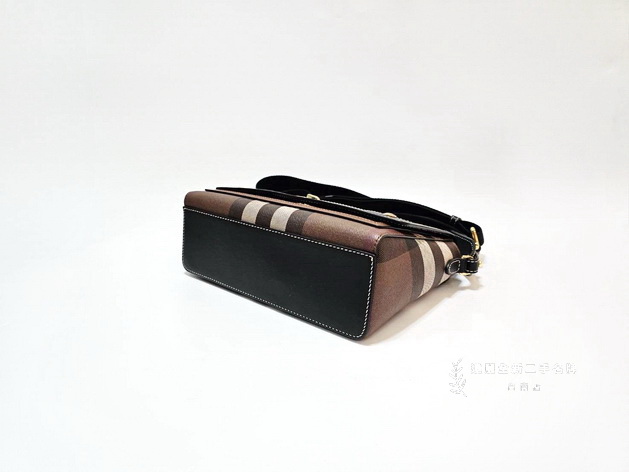 V2808 Burberry包包PVC深咖經典格紋黑皮邊金釦下蓋磁釦斜背包80713851 (台南店)
